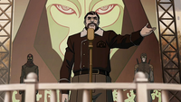 Hiroshi Sato was a nonbending industrialist and the founder of Future Industries, whose family lineage extends back to the first Fire Nation colonists.[1] A brilliant inventor, he designed the revolutionary Satomobile, an idea that caused him to become the captain of industry in his era. During a police search of his secret factory, he revealed himself to be an Equalist, creating high-tech weaponry to fight against benders,[5] and later became one of their most recognizable leaders. He was imprisoned for his crimes after the Anti-bending Revolution was put down.[6]